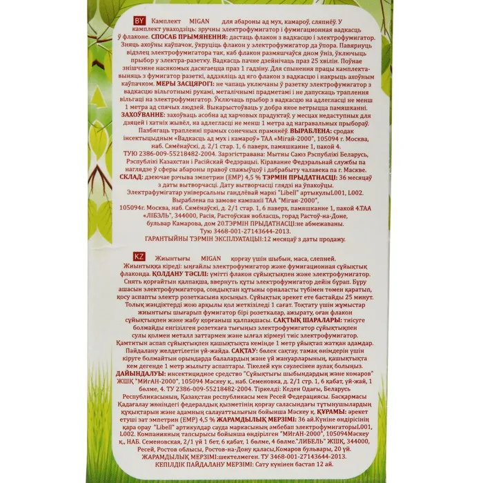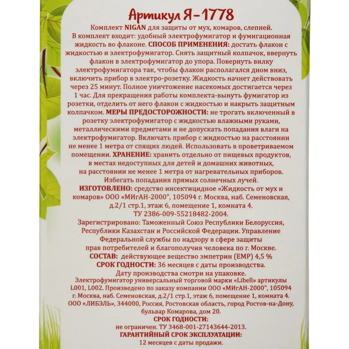 Меры предосторожности: не трогать включенный в розетку электрофумигатор влажными руками, металлическими предметами и не допускать попадания влаги на электрофумигатор. Включать комплект на
