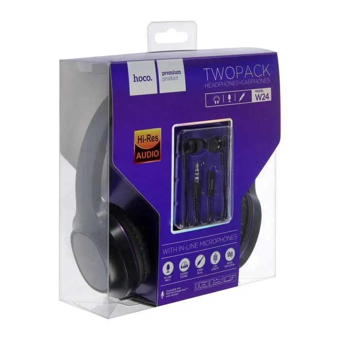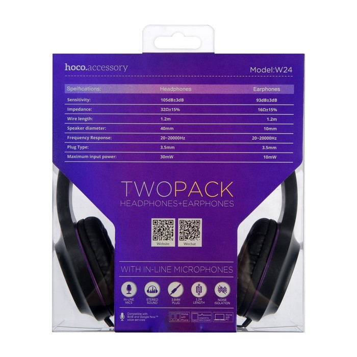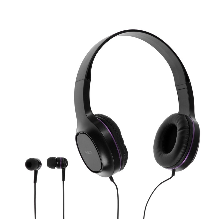Комплект наушников Hoco W24, проводные, накладные + вакуумные, проводные, фиолетовые — Характеристики