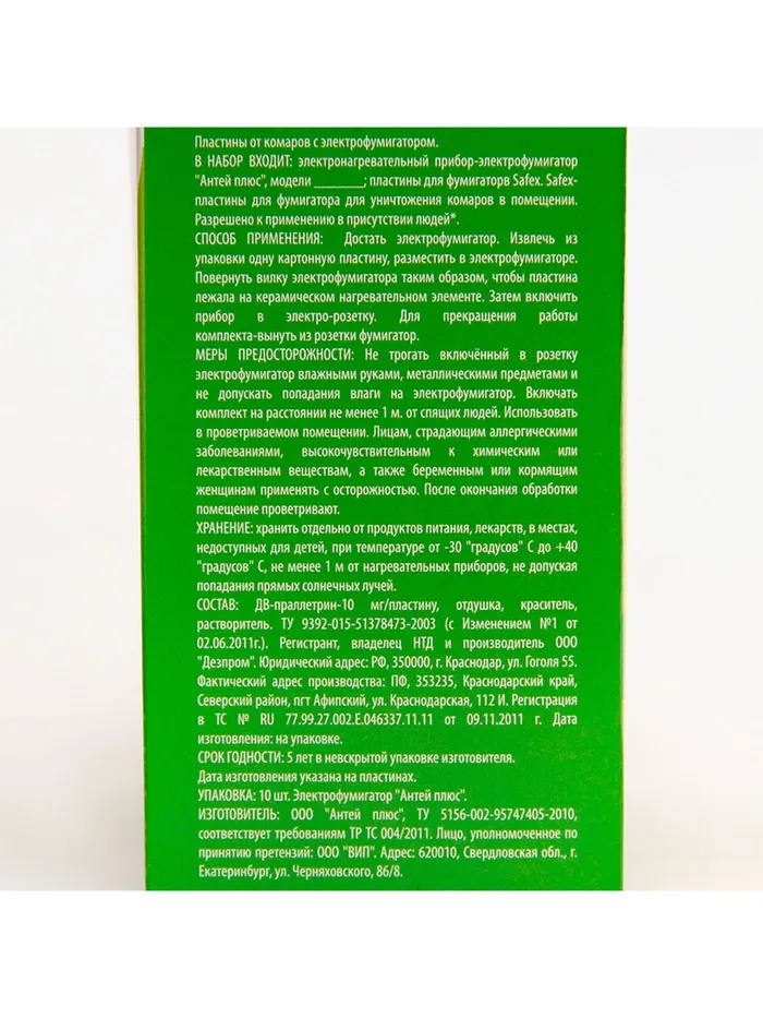 Пластины SAFEX – это ключевой компонент комплекта от комаров. Они содержат специальную жидкость, которая активируется при использовании фумигатора и создает аромат, отпугивающий насекомых. Пластины SAFEX имеют длительный срок службы и легко заменяются.