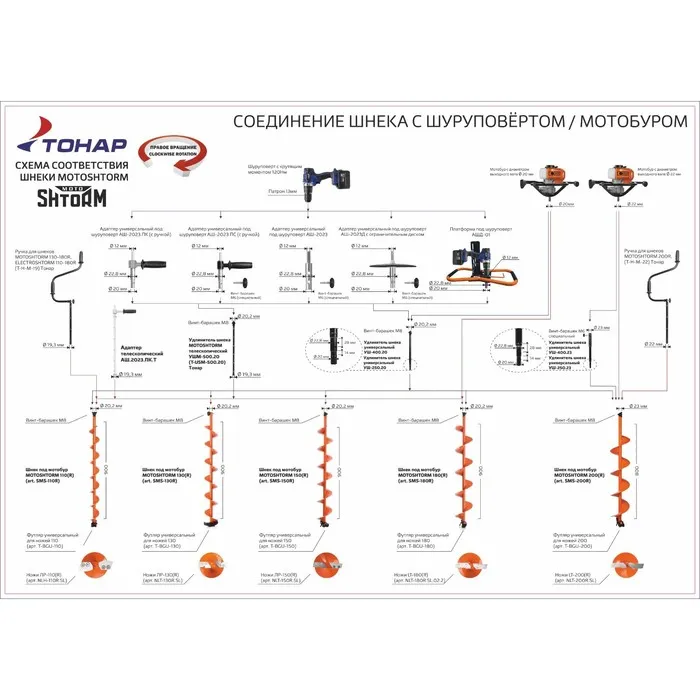 Комплект под мотобур состоит из шнека MOTOSHTORM 150(R) с правым вращением, адаптера АШ-25У и прорезиненного молоточка.