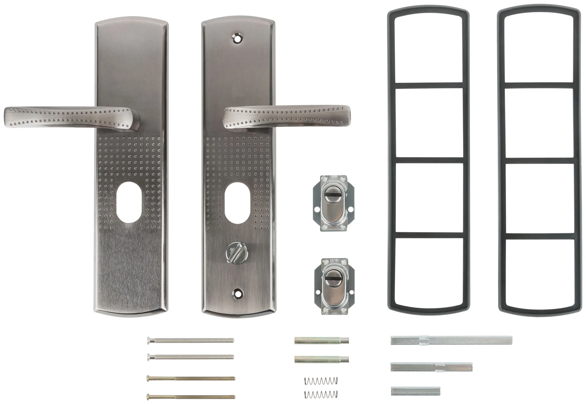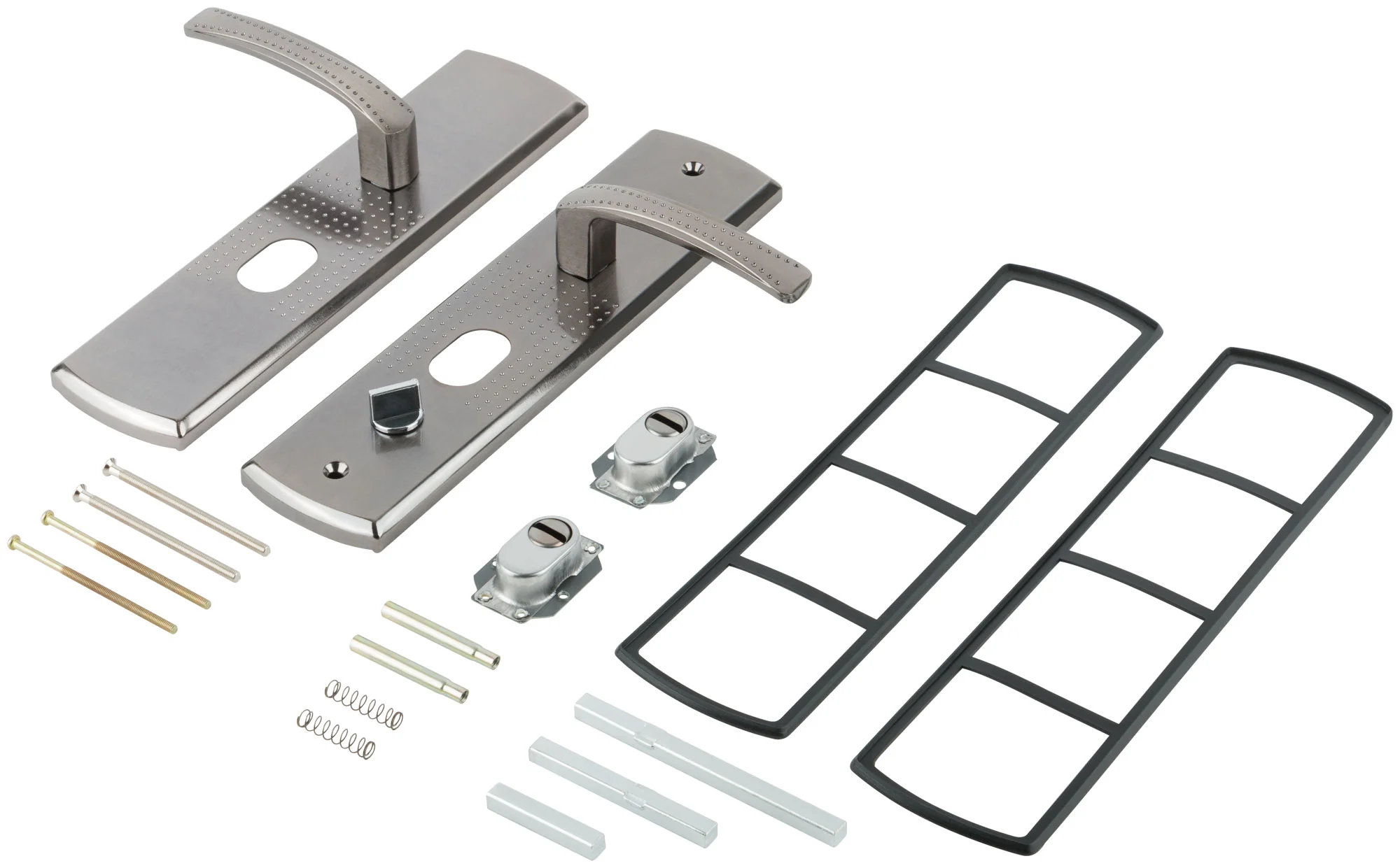 Комплект включает в себя две ручки, винтовые стяжки, пластиковые прокладки, квадрат 8х8 мм длиной 110 мм и комплекты стержней для автоматических замков. Упаковано в картонную коробку для удобства транспортировки и хранения.
