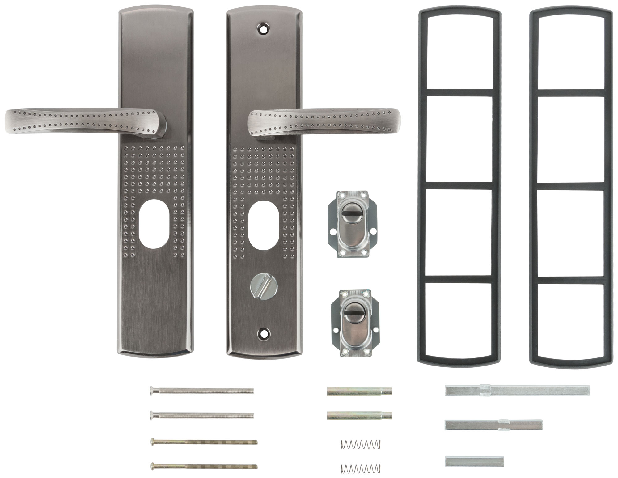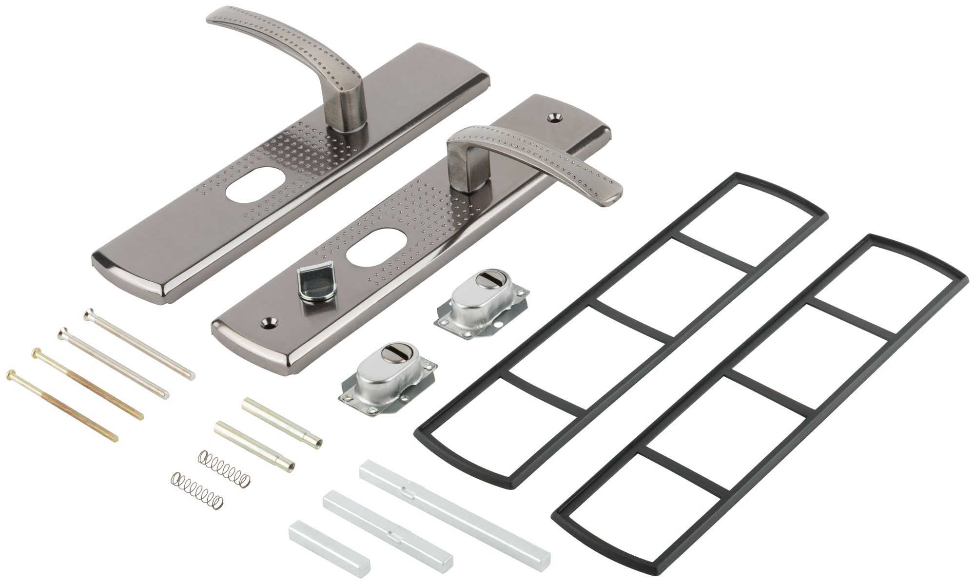 В комплект входят все необходимые компоненты для установки: две ручки, винтовые стяжки, пластиковые прокладки и квадратный штырь. Это позволяет быстро и без лишних усилий установить ручки на двери как левого, так и правого открывания.