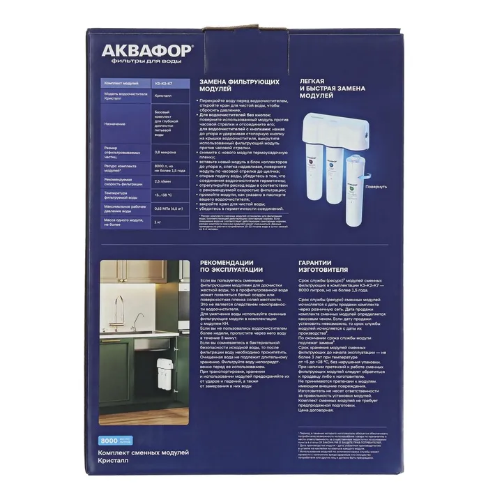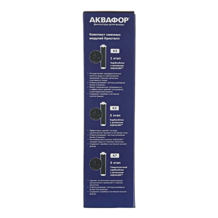 Комплект модулей для "Аквафор" Кристалл – подойдет мягкой воды. Используется как полный комплект сменных модулей в фильтре Аквафор Кристалл (для мягкой воды) или как набор предфильтров в системе Аквафор КОСМО.