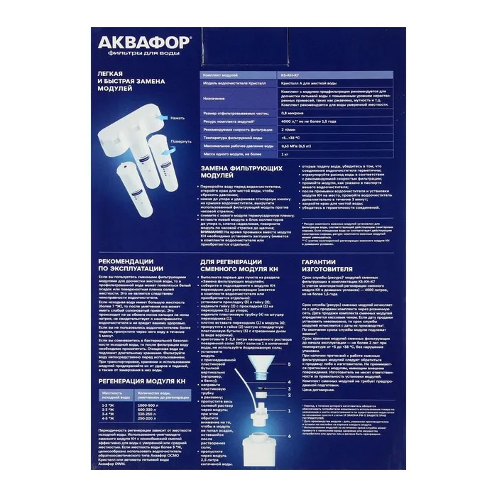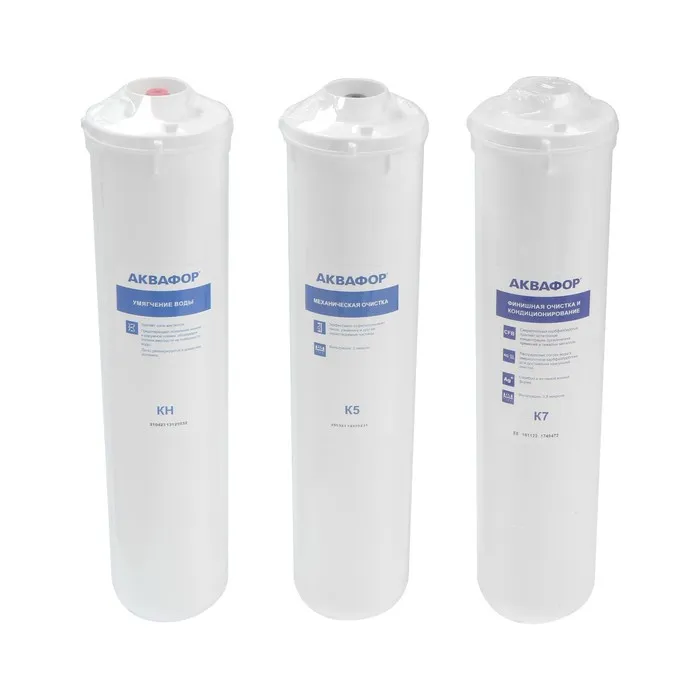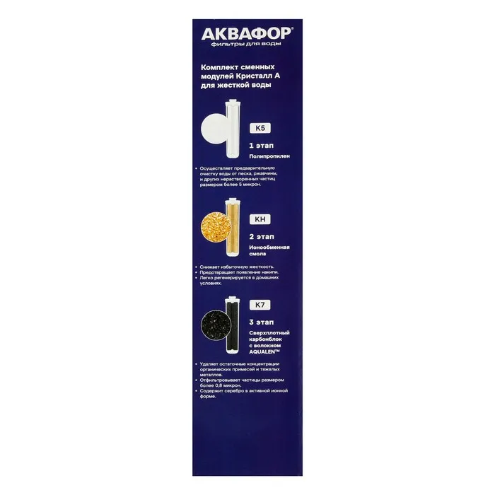 Подходит для любого 3-х ступенчатого фильтра Кристалл от Аквафор (корпус фильтра менять не нужно - только картриджи).Вкусная и безопасная вода.Быстрая замена картриджей.Данный фильтр комплектуется умягчающим картриджем КН. Умягчающий модуль KH эффективен для воды умеренной жесткости.