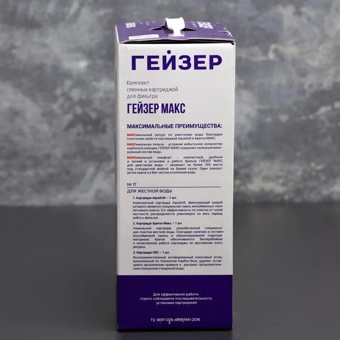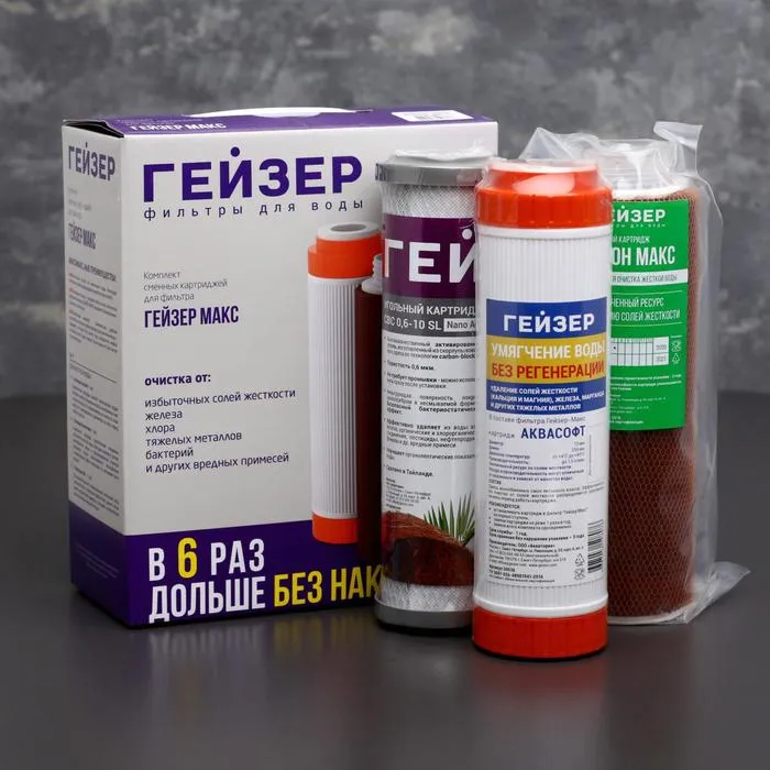 Комплект сменных картриджей для фильтра «Гейзер. Макс» предназначен для 3-ступенчатой очистки воды.