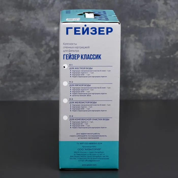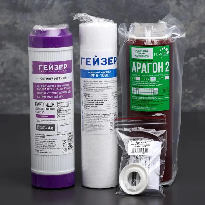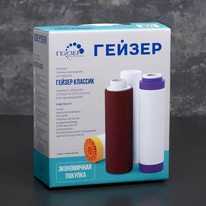 Набор содержит в себе всё необходимое для поддержания высокого уровня комплексной очистки воды в фильтрах «Гейзер Классик».