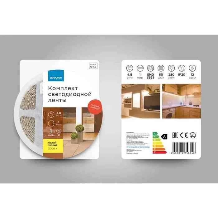 В состав готового комплекта с артикулом 10-66 входит 1 метр светодиодной ленты, которая работает от постоянного тока с напряжением 12В. Благодаря светодиодам smd 3528 излучающим световой поток равный 280 Лм/м лента является прекрасным решением для воплощения в жизнь такого элемента декора, как декоративная подсветка. Она подойдет для декорирования ниш в стенах, многоуровневых потолков и даже мебели. По сравнению с лампами накаливания светодиодная лента эквивалентна лампам мощностью 25 Вт. Данная модель светодиодной ленты обладает теплым белым цветом свечения с цветовой температурой 3000 К. Также в состав комплекта входит адаптер питания с вилкой в розетку на корпусе, проводом с выключателем и коннектором стандарта 5,5х2,1 для подключения светодиодной ленты, с другой стороны. Степень защиты такого адаптера соответствует стандарту IP44 и допускает установку во влажных местах, но в то же время должна сохраниться защита от прямого попадания воды. Степень защиты светодиодной ленты соответствует стандарту IP20, что подразумевает использование только в сухих и проветриваемых помещениях. Отрезать светодиодную ленту можно в специально отмеченных местах, которые располагаются через каждые 50 мм. Компактные размеры светодиодной ленты с шириной 8 мм и основанием из гибкой, двухслойной, медной подложки дают огромное преимущество при создании любых дизайнерских фантазий.