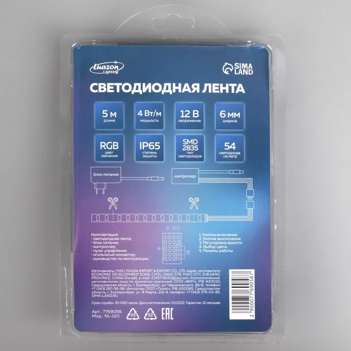 Комплект светодиодной ленты Luazon Lighting 5 м, IP65, SMD2835, 54 LED/м, 12 В, RGB — Характеристики