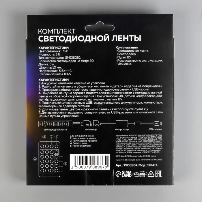 Комплект светодиодной ленты Luazon Lighting 5 м, IP65, SMD5050, 30 LED/м, USB, пульт ДУ, RGB — Характеристики