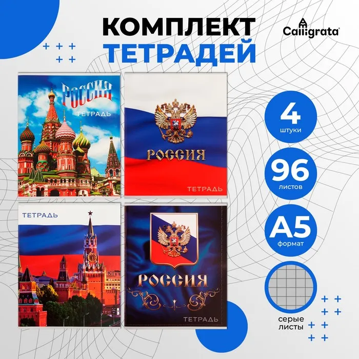 Комплект тетрадей из 4 штук, 96 листов в клетку Calligrata "Россия", обложка мелованный картон, блок №2, белизна 75% (серые листы) — Характеристики