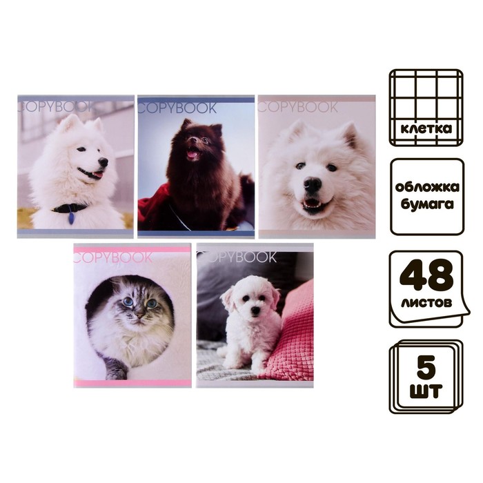 Комплект тетрадей из 5 штук, 48 листов в клетку Calligrata "Любимые питомцы", обложка мелованная бумага, блок №2, белизна 75% (серые листы) — Характеристики