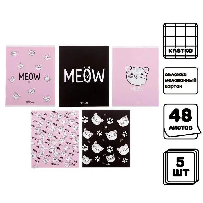 Комплект тетрадей из 5 штук, 48 листов в клетку Calligrata "Meow", обложка мелованный картон, блок офсет — Характеристики
