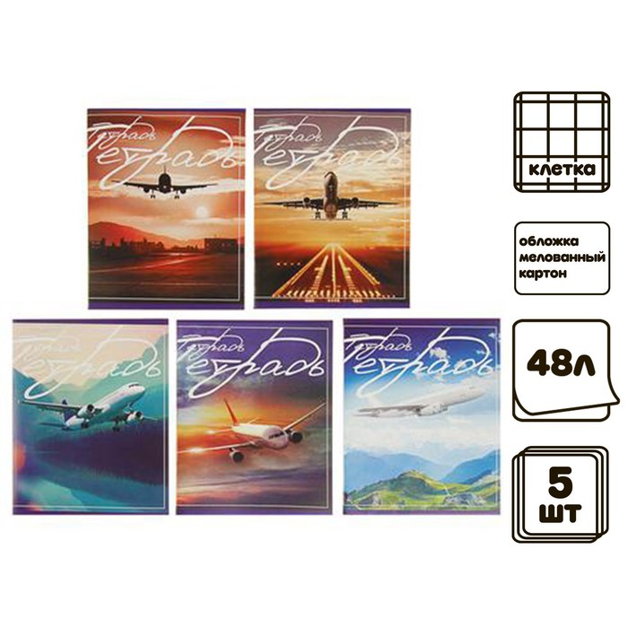 Комплект тетрадей из 5 штук, 48 листов в клетку Calligrata "Самолеты", обложка мелованный картон, блок №2, белизна 75% (серые листы) — Характеристики