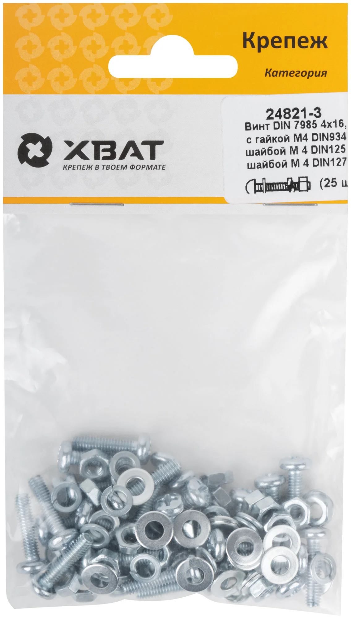 Комплект поставляется в удобной фасовке по 25 штук, обеспечивая готовность к работе в любой момент. Благодаря стандартам DIN7985, DIN934, DIN125 и DIN127, все элементы совместимы с большинством стандартных крепежных систем.