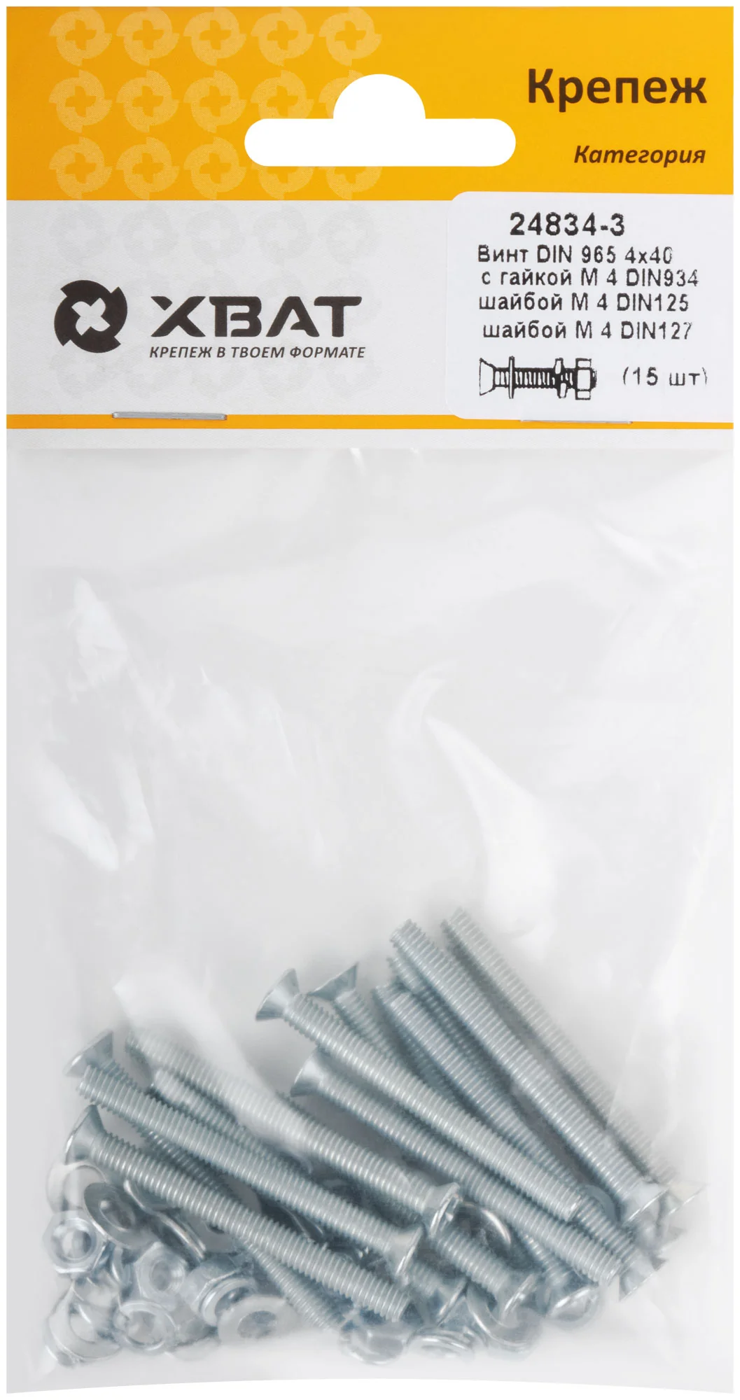 Каждый элемент комплекта соответствует стандартам DIN: винты DIN965 4х40, гайки DIN934, шайбы DIN125 и DIN127. Все компоненты изготовлены из высококачественных материалов, что гарантирует их прочность и долговечность.