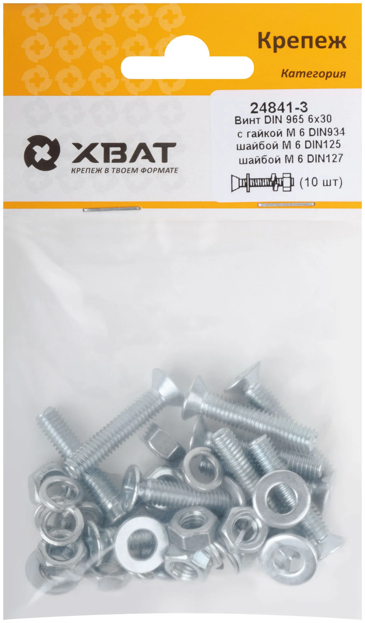 В комплект входят винты DIN965 размером 6х30 мм, гайки М6 по стандарту DIN934, а также шайбы М6 по стандартам DIN125 и DIN127. Это универсальный набор для различных крепежных задач, который подойдет как профессиональным мастерам, так и домашним умельцам.