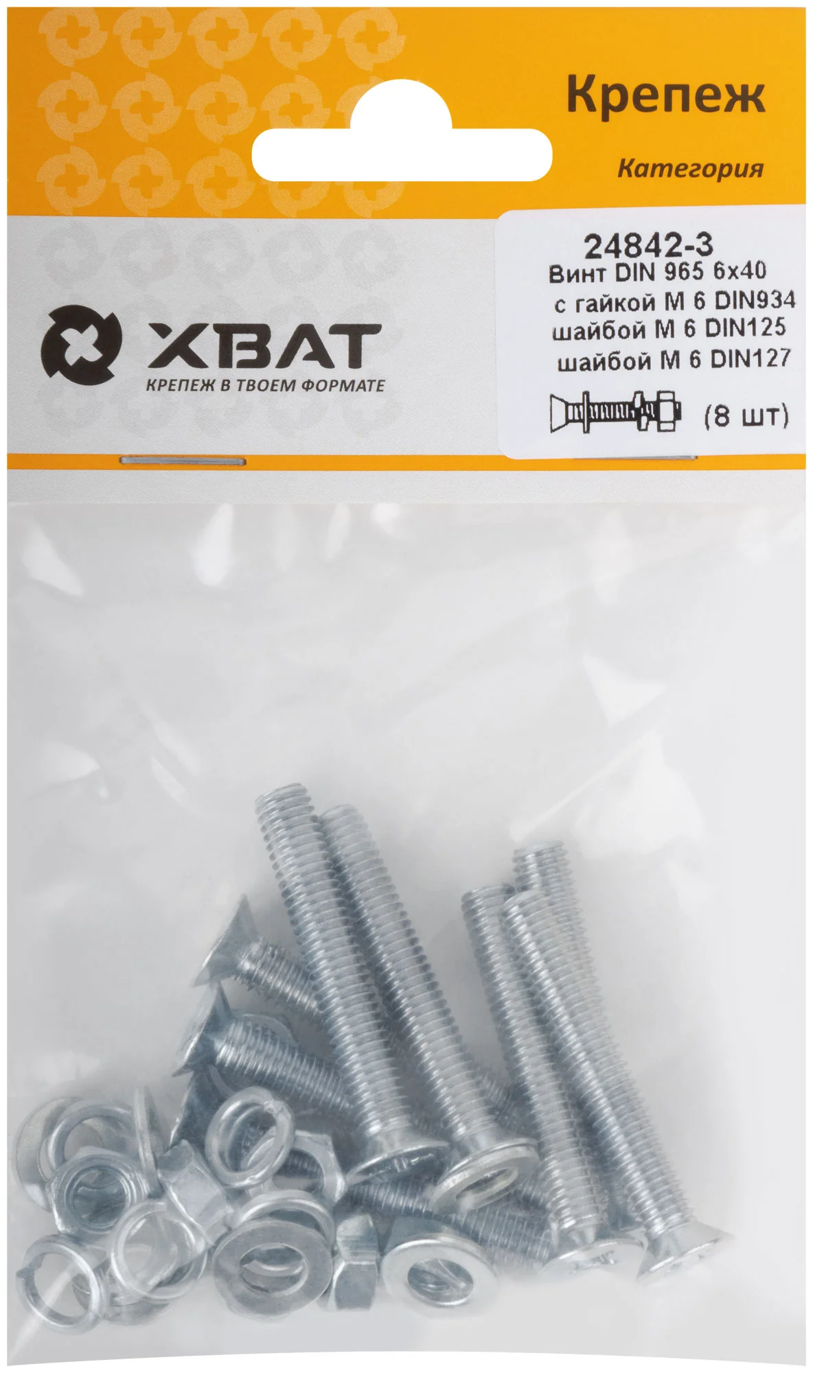 Комплект: Винт DIN965 6х40, с гайкой М6 DIN934, шайбой М 6 DIN125, шайбой М 6 DIN127 (фасовка 8шт.)