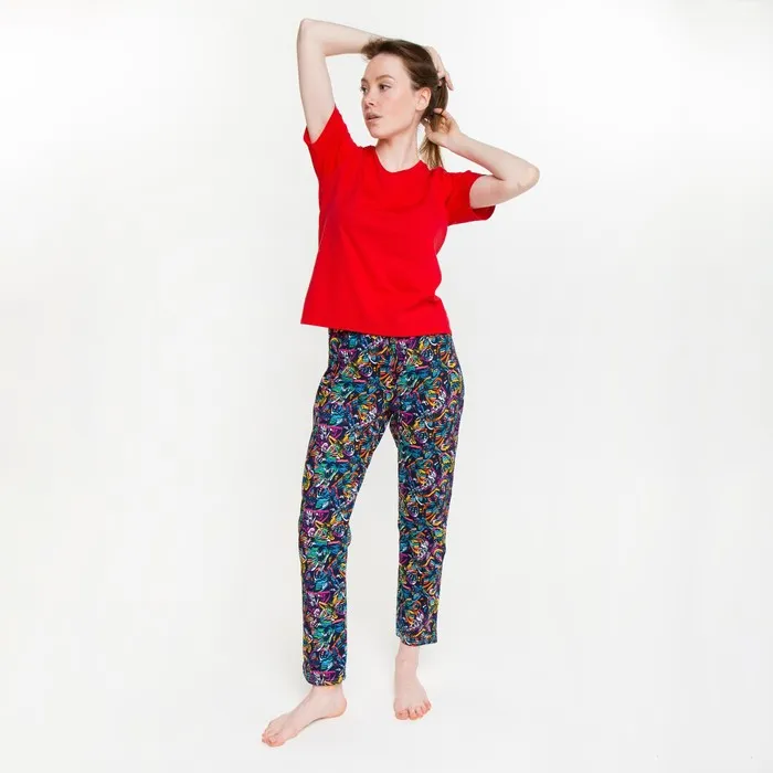 Комплект женский (футболка/брюки), цвет красный/бабочки, размер 54