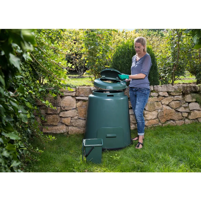 Компостер имеет большое загрузочное отверстие и скользящую крышку для удаления содержимого. Использование облегчает круглая форма компостера, готовая компостная масса не может застрять в углах, как в угловатых моделях.