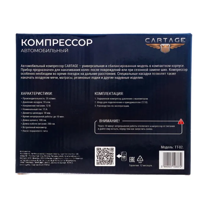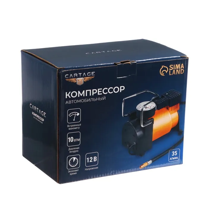 Компрессор автомобильный, CARTAGE, серия Торнадо 35 л/мин, цвет золото — Характеристики