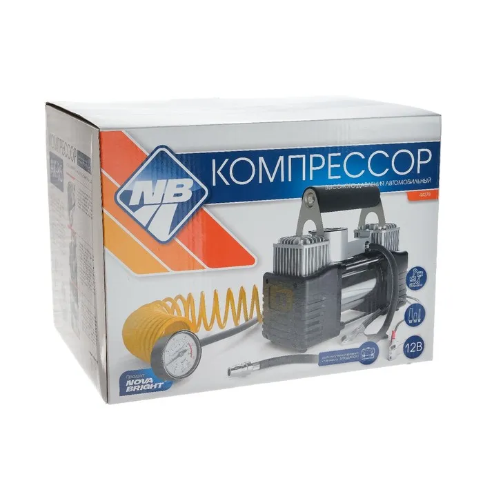 Используйте двухпоршневой компрессор Nova Bright для накачивания воздухом шин легковых и грузовых автомобилей. Может применяться также для мячей, лодок и других надувных изделий.