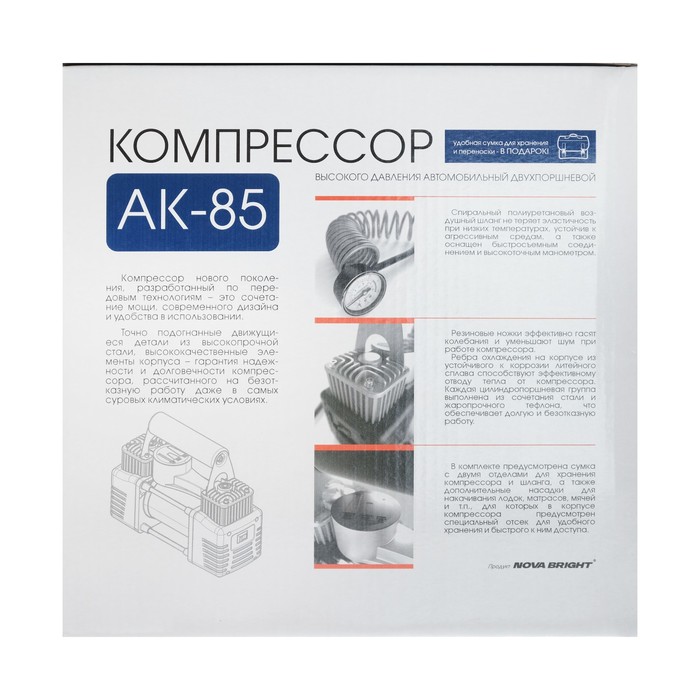 Компрессор автомобильный Nova Bright АК-85, двухпоршневой, 85 л/мин, 12 В, в сумке — Характеристики
