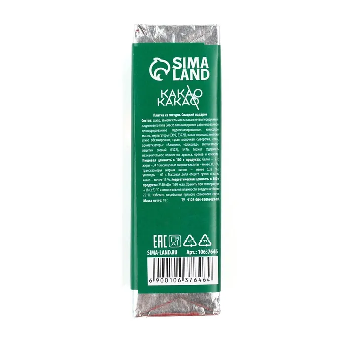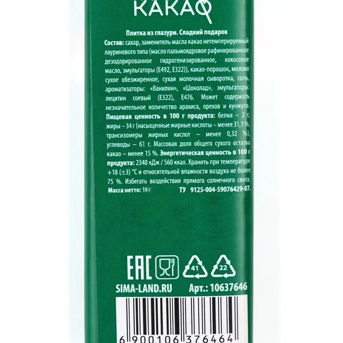 Состав: сахар, заменитель масла какао нетемперируемый лауринового типа (масло пальмоядровое рафинированное дезодорированное гидрогенизированное, кокосовое масло, эмульгаторы (Е492, Е322)), какао-порошок, молоко сухое обезжиренное, сухая молочная сыворотка, соль, ароматизаторы: «Ванилин», «Шоколад», эмульгаторы: лецитин соевый (Е322), Е476. Может содержать незначительное количество арахиса, орехов и кунжута.
