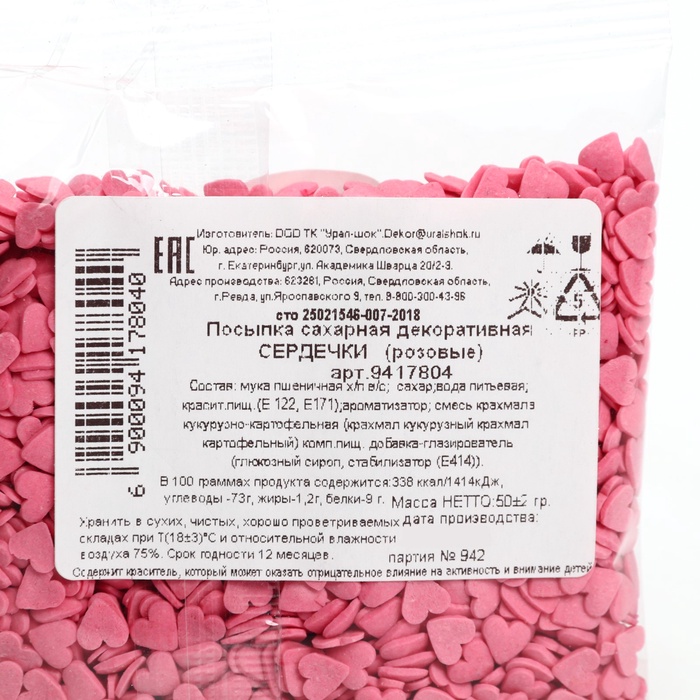 Состав: сахар, мука пшеничная, мука рисовая, масло пальмовое, крахмал кукурузный, вода питьевая, клетчатка соевая, дектроза, загустители (мальтодекстрин, ксантовая камедь), глазирователь (шеллак), краситель пищевой (Е171,Е122)
