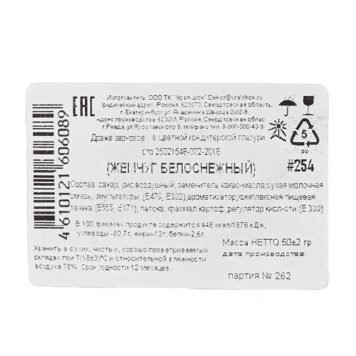 Кондитерская посыпка с мягким центром «Жемчуг», белоснежная, 50 г — Характеристики