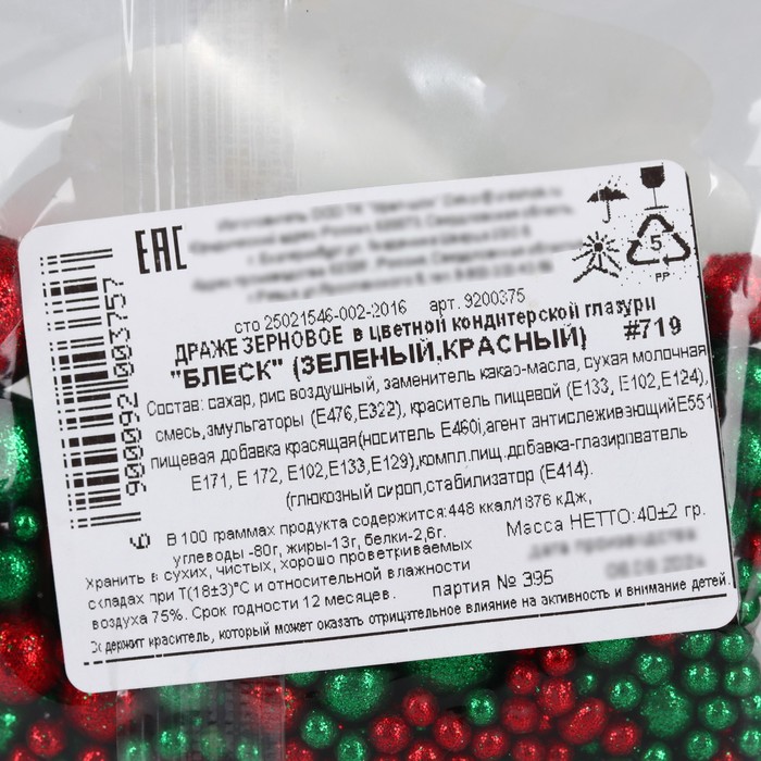 Состав: сахар; рис воздушный (крупа рисовая, мука пшеничная); заменитель какао-масла нелауринового типа нетемперируемый (фракционированное, частично гидрогенизированное пальмовое масло); сухая молочная смесь (сыворотка сухая, сухое обезжиренное молоко, сухое цельное молоко, лактоза, молочный протеин); эмульгаторы: (Е476, Е322), ароматизатор «Ванилин»; красители пищевые: (Е124, Е102, Е133); пищевая добавка красящая (Е 460i, Е555, Е171, Е172, Е129, Е102, Е133); глянцеватель (Е414). Содержит краситель, который может оказать отрицательное влияние на активность и внимание детей.