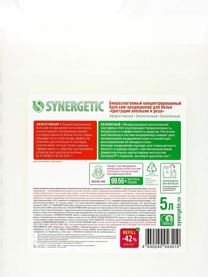 Кондиционер-бальзам для белья Synergetic «Цветущий апельсин и роза», 5 л — Характеристики