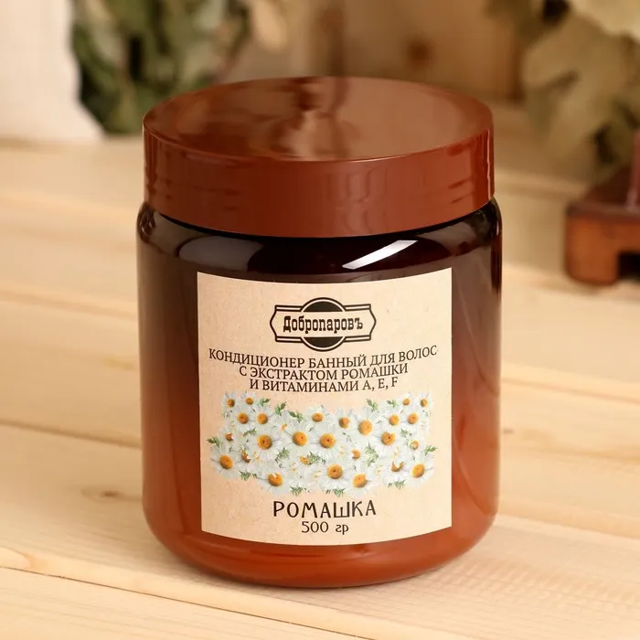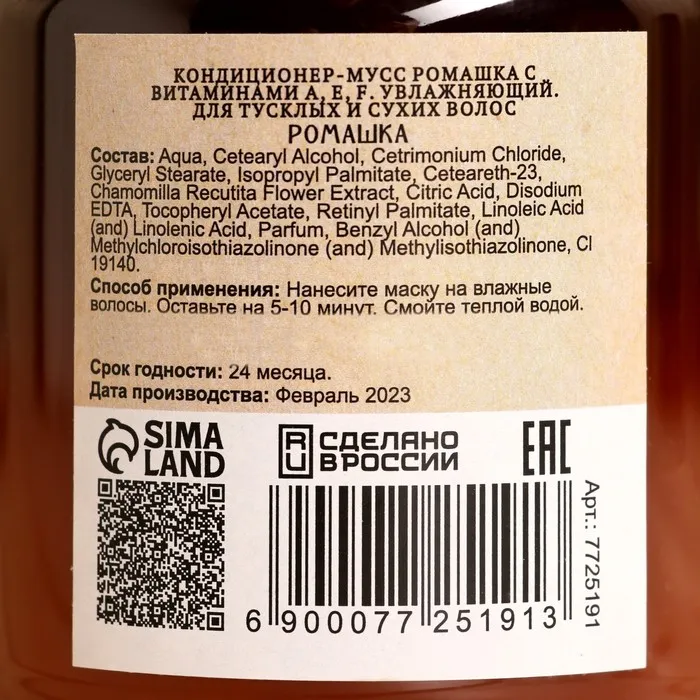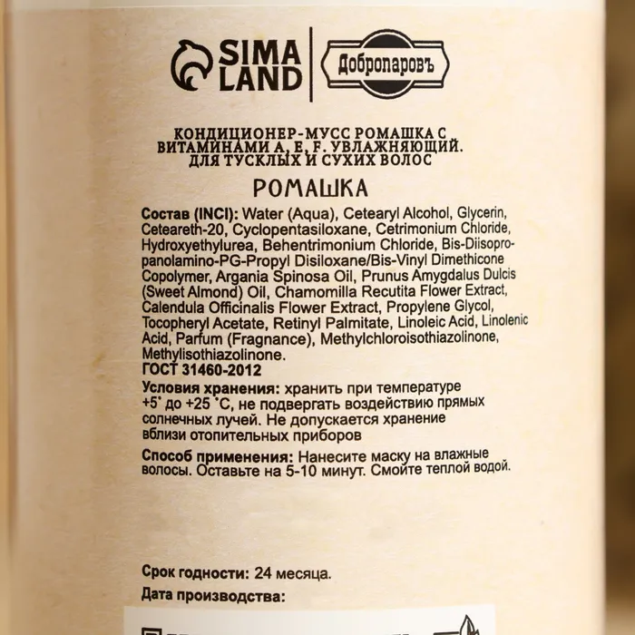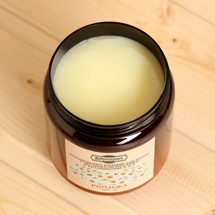 Кондиционер-мусс «Ромашка с витаминами» с витаминами А, Е, F предотвращает потускнение и ломкость волос, борется с выпадением, стимулирует рост, уменьшает выделение кожного сала. Кондиционер-мусс подходит для всех типов волос, рекомендован при секущихся кончиках. Придаёт блеск и ухоженный вид волосам, питает клетки кожи головы, активно восстанавливает структуру волос.