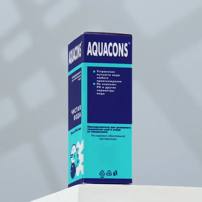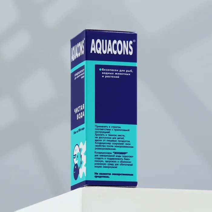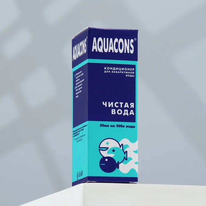 Кондиционер «Акваконс чистая вода» для аквариумной воды 50 мл предназначен для устранения мутности любого происхождения. После использования кондиционера вода становится абсолютно прозрачной. Способ применения: Добавить 5 мл средства на каждые 50 л аквариумной воды. После внесения кондиционера воду в аквариуме следует аккуратно перемешать. Если в течение 30 минут образование хлопьев визуально не наблюдается, количество следует увеличить в 2 раза и т. д. Допускается пятикратное превышение первоначальной дозы. Рекомендации по применению кондиционера: Дозировка зависит от происхождения и концентрации частиц, вызывающих мутность воды (бактериальные клетки, мельчайшие частицы грунта, одноклеточные водоросли – «цветение воды» и др.). Отсутствие процесса коагуляции (образования хлопьев) свидетельствует о том, что требуемая концентрация кондиционера в воде не достигнута. Если порог коагуляции не пройден, кондиционер не будет работать независимо от времени его применения. Образовавшиеся хлопья удаляют с помощью фильтра и грунтоочистителя. Кондиционер не изменяет рН и другие параметры воды. В рекомендуемых дозах безопасен для рыб, растений и гидробионтов.