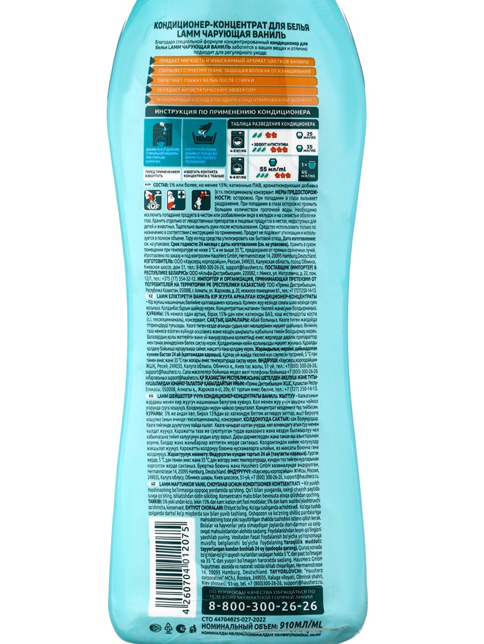 Кондиционер для белья LAMM Чарующая ваниль, концентрат, эффект антистатика, 910 мл — Характеристики