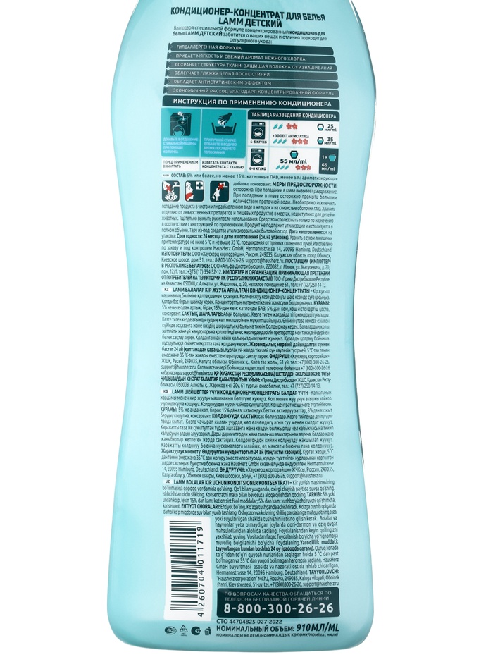 Кондиционер для белья LAMM Детский, концентрат, гипоаллергенный, 910 мл — Характеристики