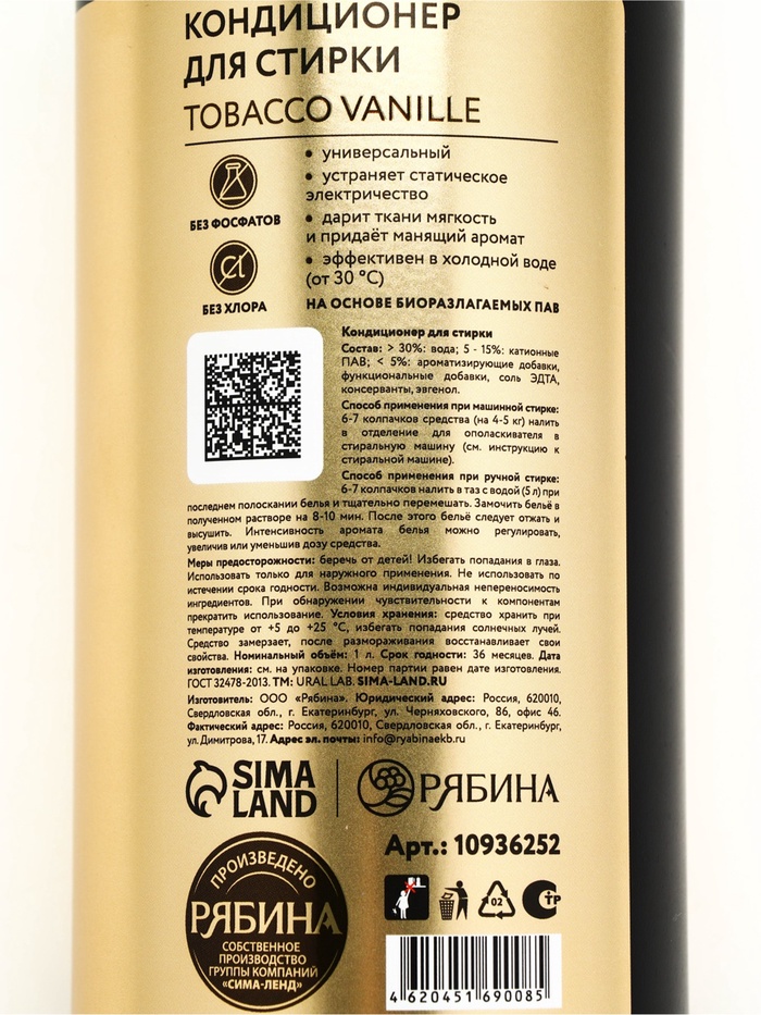 Кондиционер для белья парфюмированный Tobacco Vanille, 1000 мл, ULAB — Характеристики