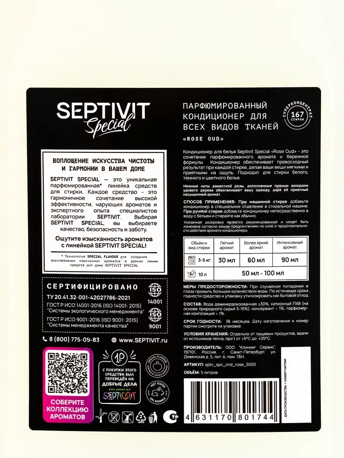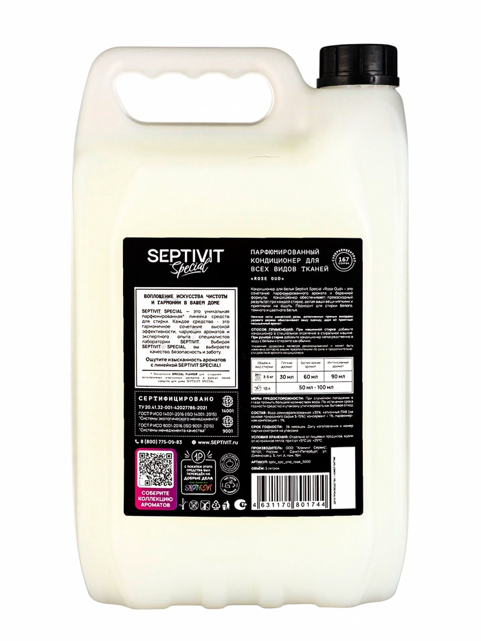 Погрузите своё бельё в благородную гармонию розы и благовонного уда с кондиционером Septivit Special «Rose Oud». Богатый и глубокий аромат придаёт тканям нежность и шелковистость, создавая ощущение роскоши и комфорта. Формула кондиционера бережно ухаживает за волокнами, облегчает глажку и защищает цвета от выцветания, продлевая срок службы ваших любимых вещей.