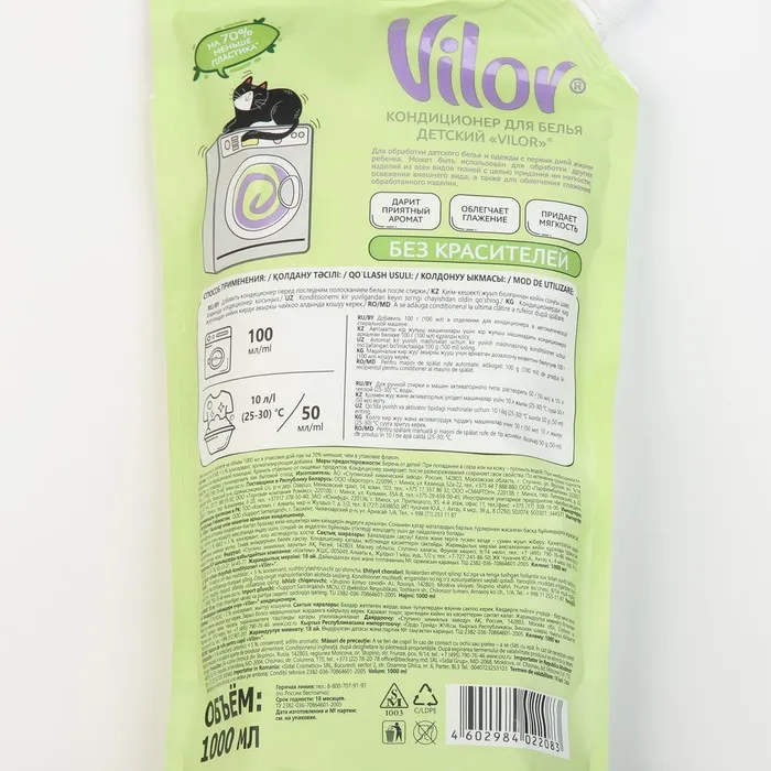 Кондиционер Vilor «Детский» для изделий из ткани придаст вашим вещам мягкость и сделает их приятными на ощупь. Средство обладает антистатическим эффектом, облегчает глажку белья, освежает краски цветных изделий и способствует сохранению формы одежды. После стирки ваша одежда будет окутана приятным, изысканным ароматом, который останется на долгое время. Кроме того, кондиционер ускоряет процесс сушки белья и подходит как для ручной, так и для машинной стирки.