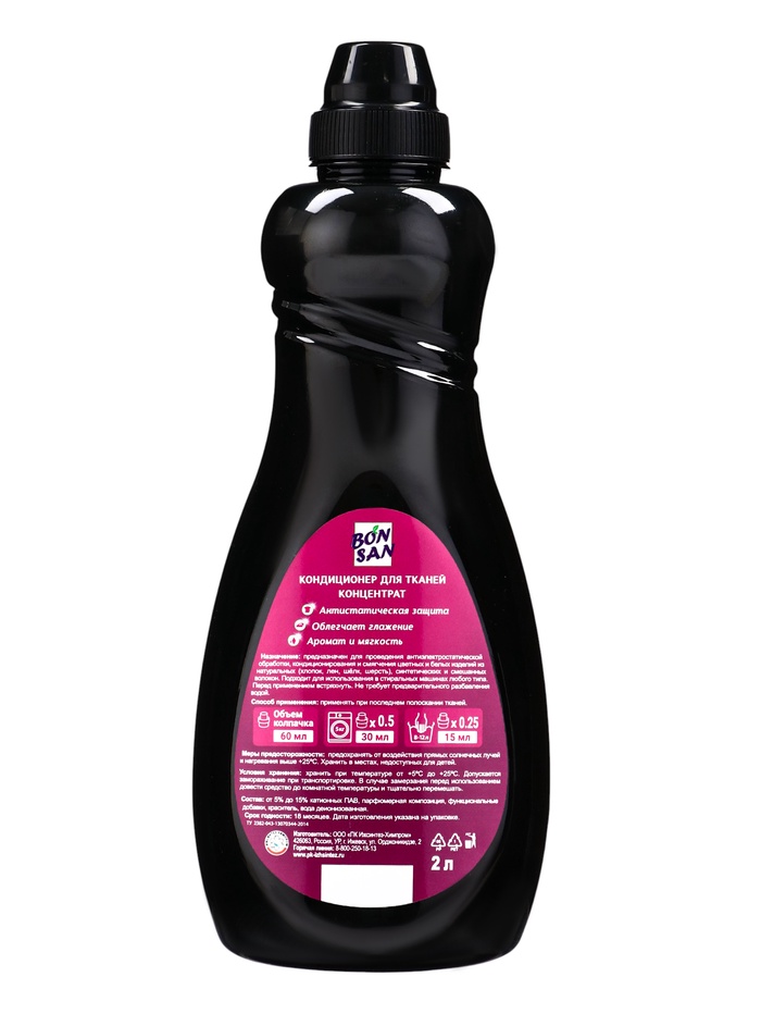 Кондиционер-концентрат для тканей Bonsan Нежное прикосновение 2 л. Подходит для использования в стиральных машинах любого типа. Перед применением встряхнуть. Не требует предварительного разбавления водой. Способ применения: применять при последнем полоскании тканей.