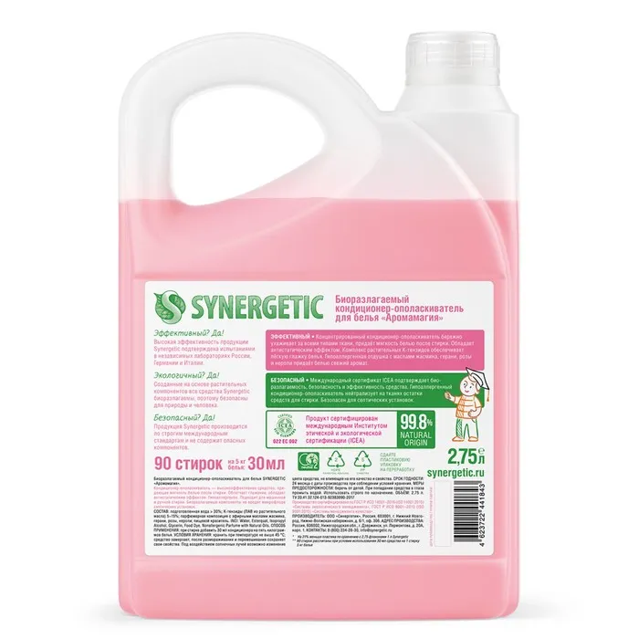 Биоразлагаемый кондиционер-ополаскиватель для белья SYNERGETIC "Аромамагия" – высокоэффективное средство, бережно ухаживающее за всеми типами ткани, в том числе деликатными, и придающее особую мягкость и нежность белью после стирки.