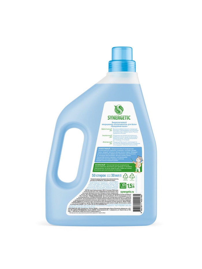 Биоразлагаемый кондиционер-ополаскиватель для белья SYNERGETIC "Бескрайний океан" – высокоэффективное средство, бережно ухаживающее за всеми типами ткани, в том числе деликатными, и придающее особую мягкость и нежность белью после стирки.