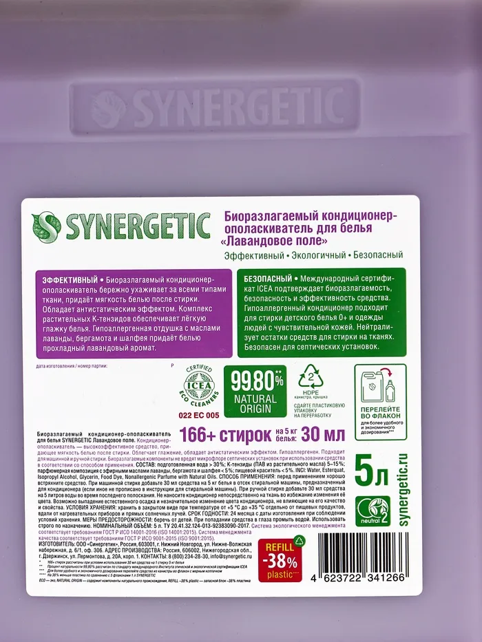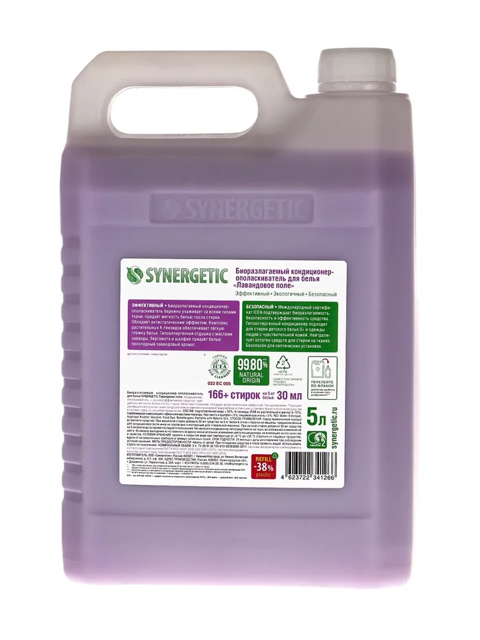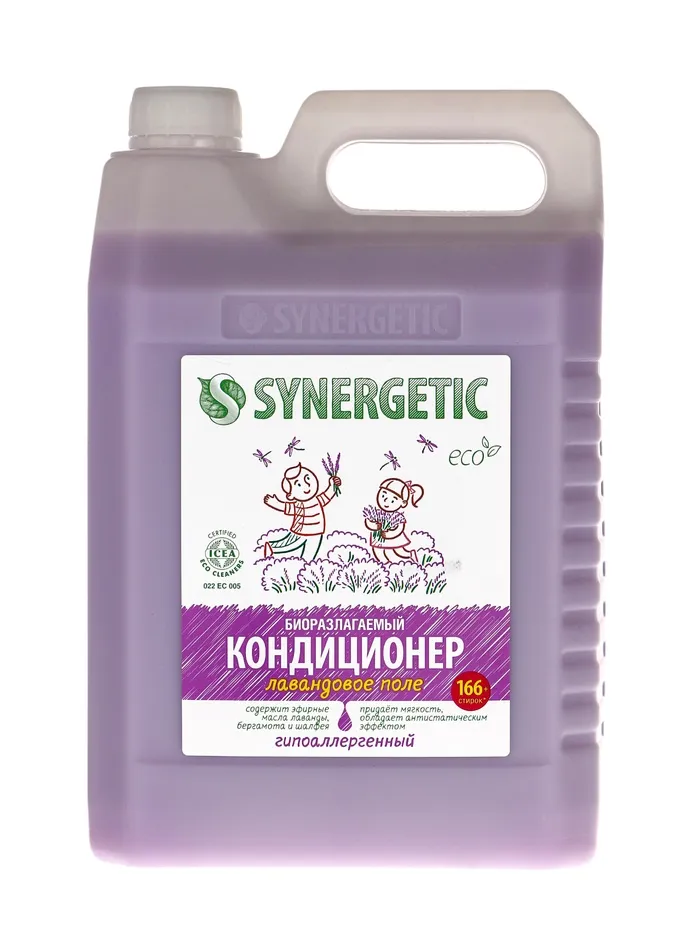 Биоразлагаемый кондиционер-ополаскиватель для белья SYNERGETIC "Лавандовое поле" – высокоэффективное средство, бережно ухаживающее за всеми типами ткани, в том числе деликатными, и придающее особую мягкость и нежность белью после стирки.