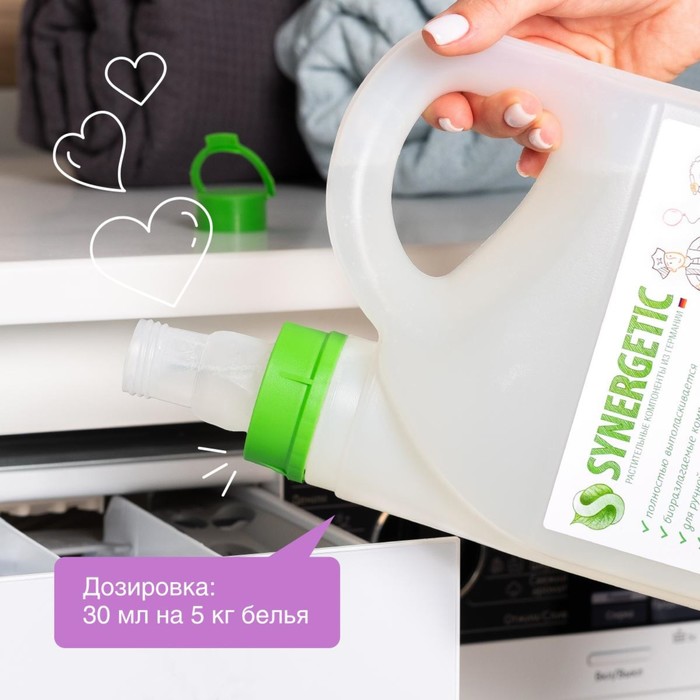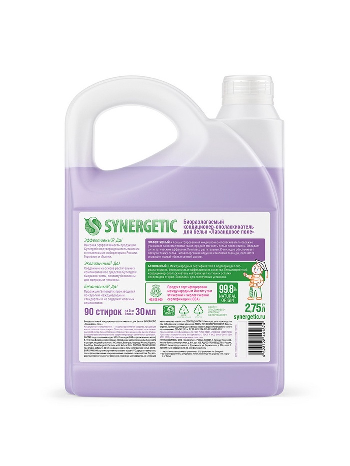 Биоразлагаемый кондиционер-ополаскиватель для белья SYNERGETIC "Лавандовое поле" – высокоэффективное средство, бережно ухаживающее за всеми типами ткани, в том числе деликатными, и придающее особую мягкость и нежность белью после стирки.