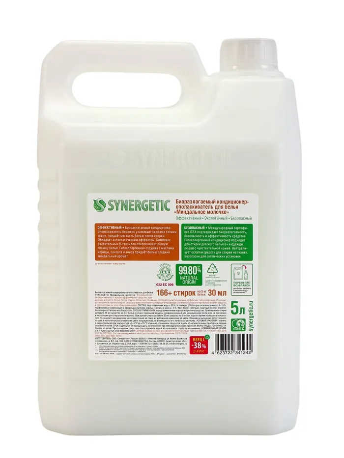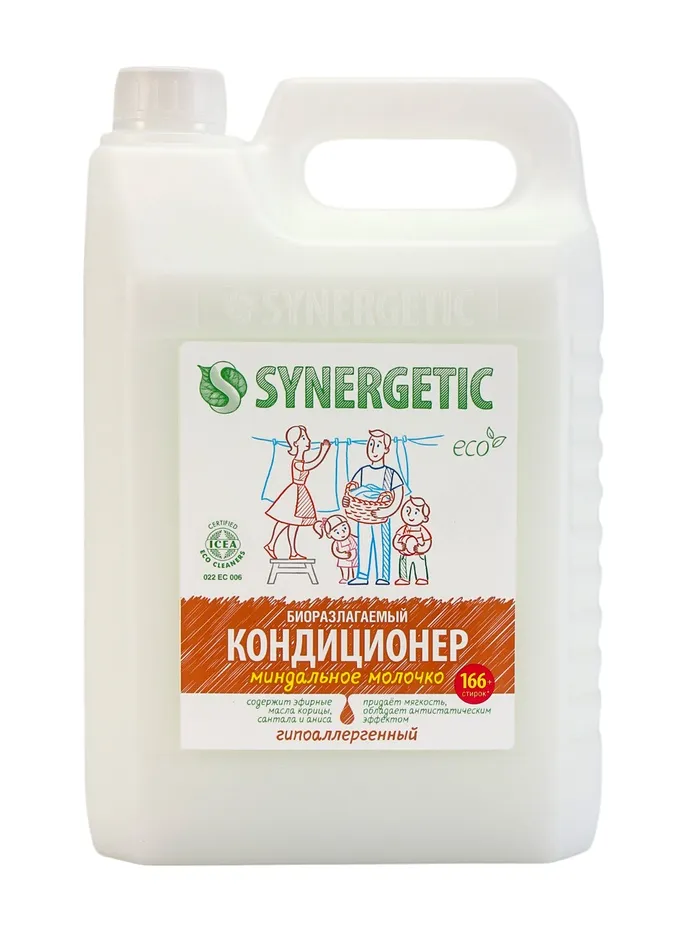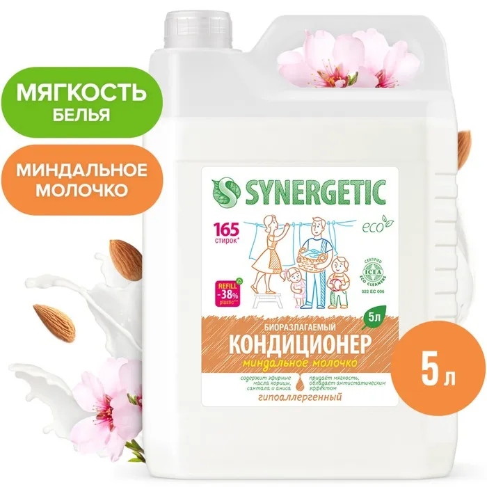Кондиционер-ополаскиватель для белья Synergetic "Миндальное молочко",гипоаллергенный,биоразлагаемый, 5 л