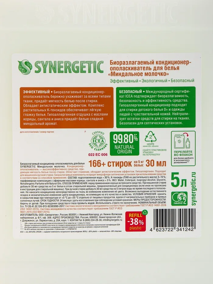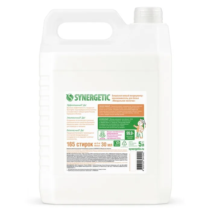 Кондиционер-ополаскиватель для белья Synergetic "Миндальное молочко",гипоаллергенный,биоразлагаемый, 5 л — Характеристики
