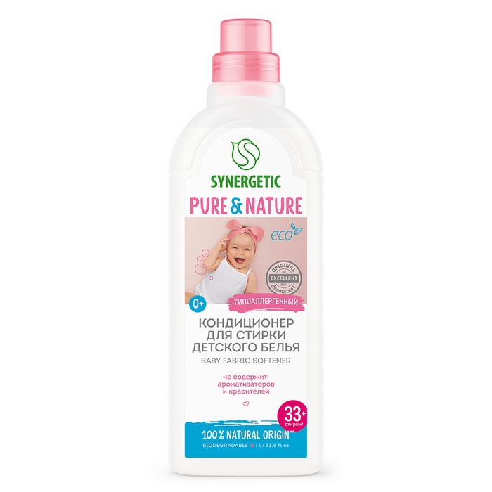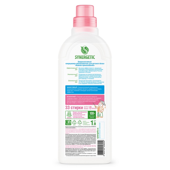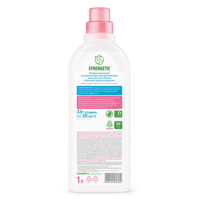 Биоразлагаемый кондиционер-ополаскиватель для детского белья SYNERGETIC "Нежное прикосновение" – высокоэффективное средство, бережно ухаживающее за всеми типами ткани, в том числе деликатными, и придающее особую мягкость и нежность белью после стирки.