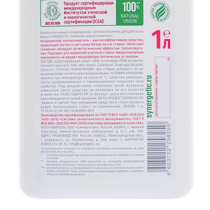 Кондиционер безопасен для белья новорожденных 0+ и одежды людей с чувствительной кожей. Не содержит ароматизаторов и красителей. Международный экологический сертификат ICEA подтверждает биоразлагаемость, безопасность и эффективность средства. Дерматологически протестирован в Европе. Биоразлагаемые компоненты не вредят микрофлоре септических установок.