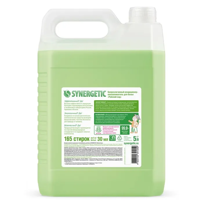 Биоразлагаемый кондиционер-ополаскиватель для белья SYNERGETIC "Райский сад"– высокоэффективное средство, бережно ухаживающее за всеми типами ткани, в том числе деликатными, и придающее особую мягкость и нежность белью после стирки.
