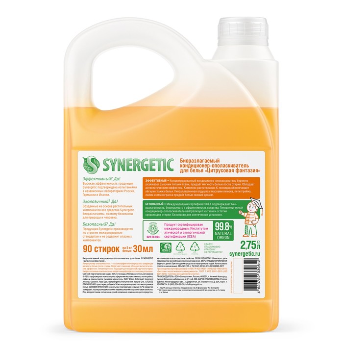 Биоразлагаемый кондиционер-ополаскиватель для белья SYNERGETIC "Цитрусовая фантазия" – высокоэффективное средство, бережно ухаживающее за всеми типами ткани, в том числе деликатными, и придающее особую мягкость и нежность белью после стирки.