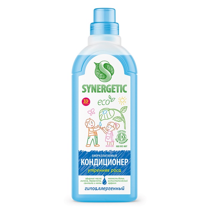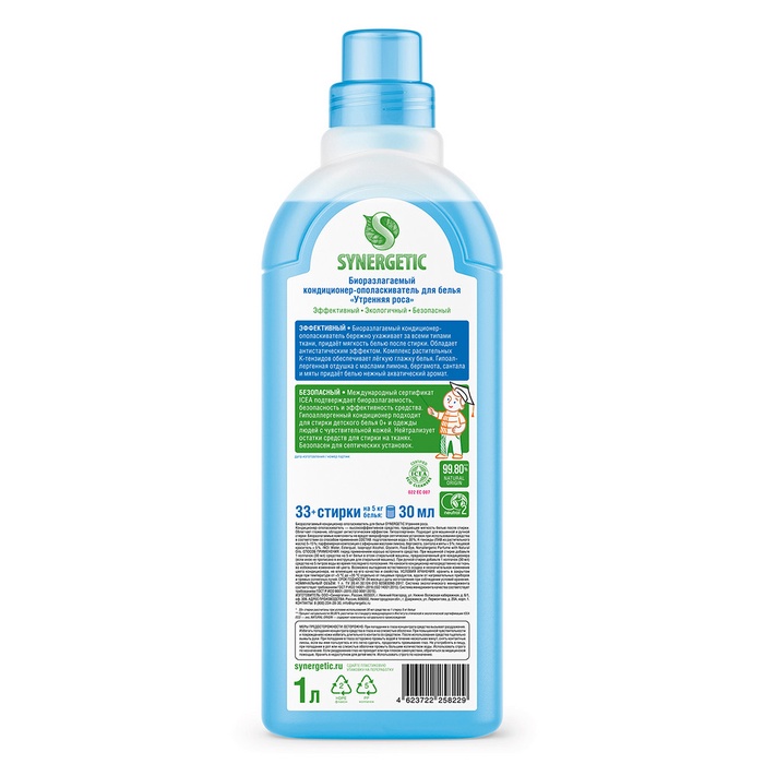 Биоразлагаемый кондиционер-ополаскиватель для белья SYNERGETIC "Утренняя роса" – высокоэффективное средство, бережно ухаживающее за всеми типами ткани, в том числе деликатными, и придающее особую мягкость и нежность белью после стирки.